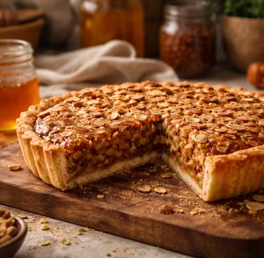 This tart is more than dessert—it is spiritual devotion. When we bake for our families, we echo Ruth gleaning in fields, the widow sharing her last flour, Christ breaking bread with disciples. Each measured cup becomes a prayer. The Ethiopian mother's whisper of "mare" reminds us our kitchens are altars of sacrificial love. This golden tart embodies Hebrews 13:2: showing hospitality to strangers, we may entertain angels unaware. The butter speaks of God's generous provision, the honey of His promised abundance. Every slice shared becomes fellowship, every bite a reminder that sweetness exists in a broken world. "Taste and see that the Lord is good; blessed is the one who takes refuge in him."[ Psalm 34:8]