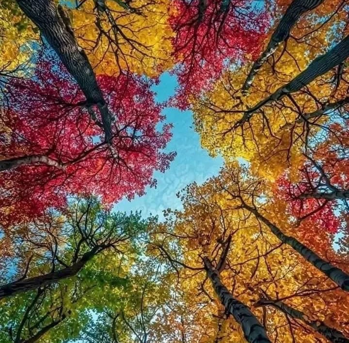 A glimpse skyward through autumn trees reveals life's journey—each color a season of struggle, growth, and the resilient faith that anchors us through change.